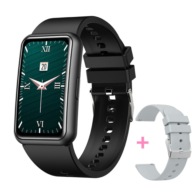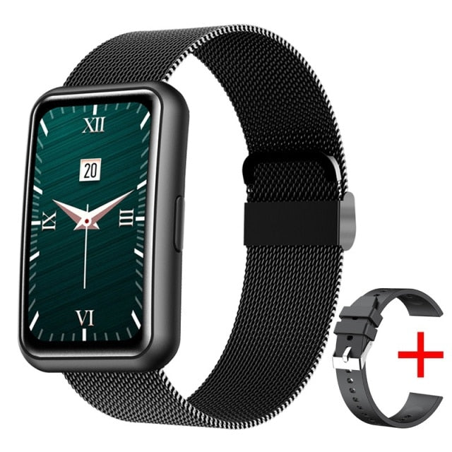 Main function:[ Custom watch face,24H continuous real-time dynamic heart rate, 8 exercise modes (steps, distance calculation, calories burned), sleep detection, Incoming call/SMS content push(APP has a switch), Information reminder(APP has a switch), Female menstrual cycle reminder